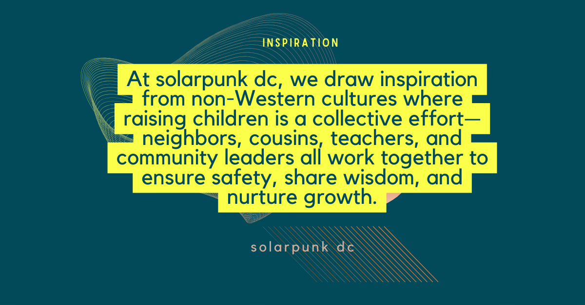 Your solarpunk dc founders come from non-western cultures, where it was common for neighbors, cousins, teachers, and community leaders to all play an important hand in raising children by ensuring they were safe, looking after them if a biological parent was unavailable, imparting wisdom and core values, and taking responsibility of contributing to their overall development. We see a trend in the U.S., and especially in DC, where families are relegated to the suburbs and the city is designated for non-child rearing individuals. We want to work towards a future where the city is for all types of people, including little humans. This means creating more opportunities for community network ties, safe streets for our less mature pedestrians, more play spaces for exploration, and cleaner, safer, public environments. The solarpunk dc pillars of community-based governance, micro-mobility/sustainable transit, a just energy transition away from fossil fuels, circular economy for a less polluted environment, and green spaces match up well for this vision.