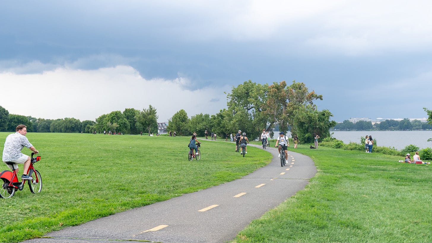 National Landing, for example, is Virginia’s largest walkable downtown, with parks (we love a picnic at Gravelly Point), access to major trails (shout out to our friends at the Mt. Vernon Trail), and lots of community-oriented activities, like free outdoor summer exercise classes at the Water Park. The re-developed neighborhood also boasts protected bike lanes, where parked cars serves as a barrier between bikes and car traffic. It’s no wonder folks are encouraged to be outside, active, and in touch with their community surroundings.